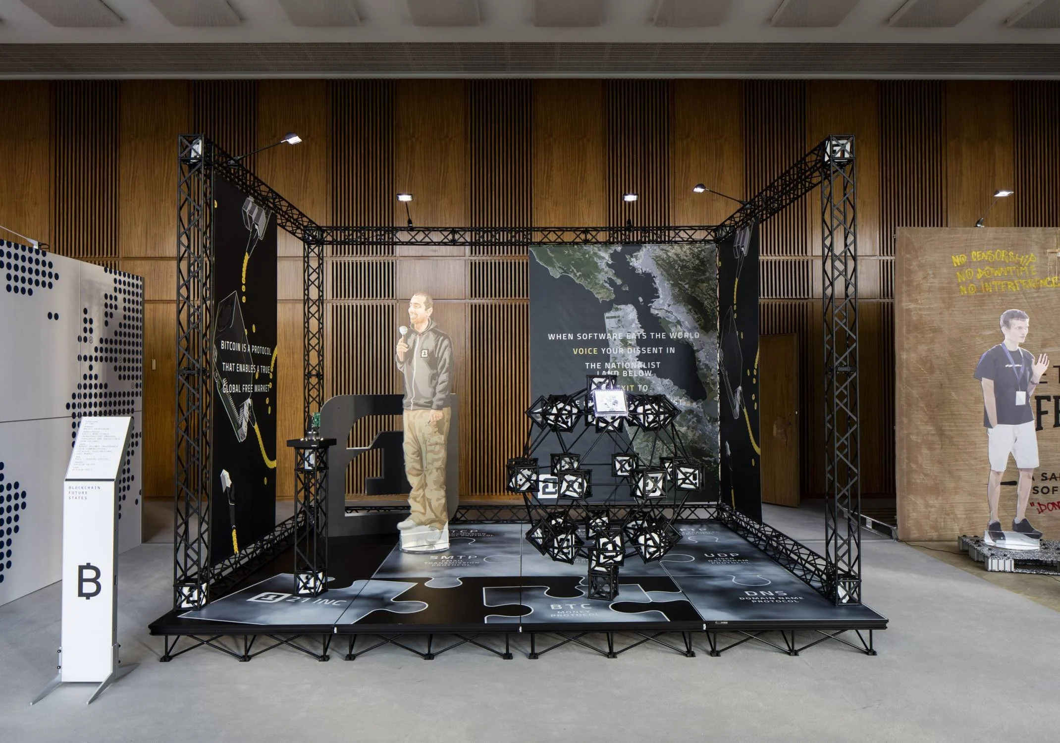 Other artists make this mismatch - between how decentralization is described and how it is experienced - visible in different ways. Simon Denny’s Blockchain Visionaries (2016–ongoing) shows how “decentralized” systems borrow centralized power aesthetics, from trade-fair displays, corporate branding, founders staged as visionaries, protocols framed as inevitabilities. What Denny makes clear is that decentralization does not escape myth-making. It produces new heroes, new centres of attention, and new forms of legitimacy. The system may be distributed, but the story is tightly managed. In this sense, decentralization functions as a performance, something that must be continuously staged to sustain belief.