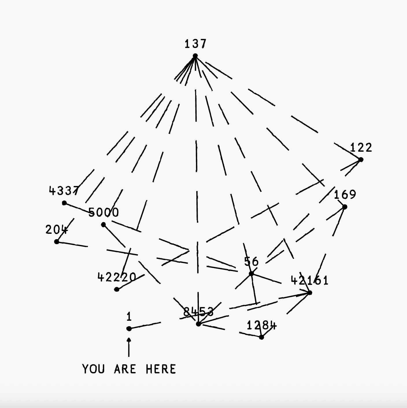 This question of where power actually resides becomes explicit in You Are Here (42161) (2023) by 0xfff. The work distills decentralization into a deceptively simple gesture: a “YOU ARE HERE” marker tied to chain ID 42161 (Arbitrum), set within a map of other EVM chain IDs connected by traces produced through bridging. Rather than presenting blockchain as placeless or abstract, it insists on situatedness. You are not everywhere. You are here, within a specific protocol, under particular rules, dependencies, and governance assumptions. In doing so, the work makes infrastructure legible as a cultural condition. Decentralization does not erase location or responsibility; it redefines them. What appears distributed still has a centre, even if that centre is no longer visible, only felt.