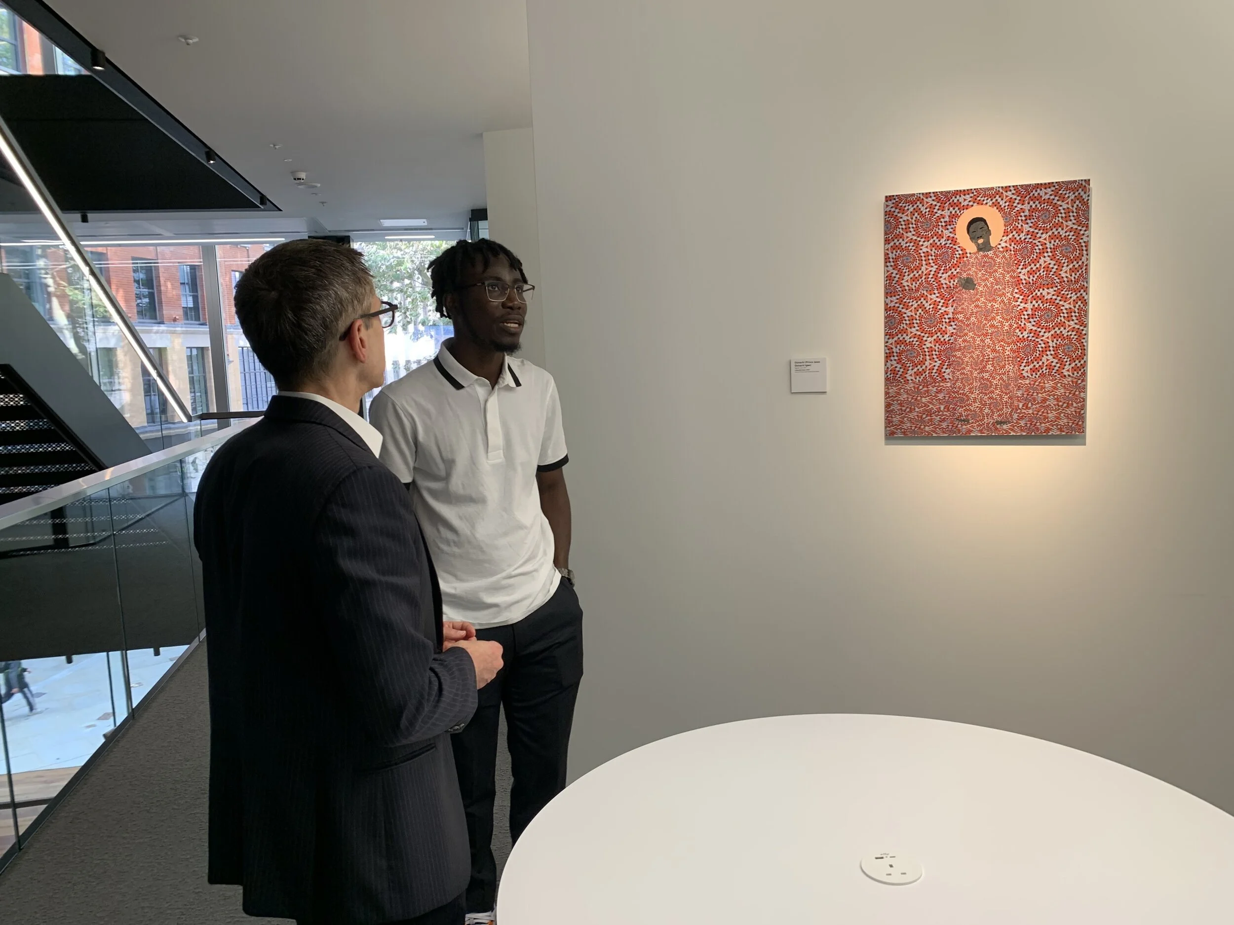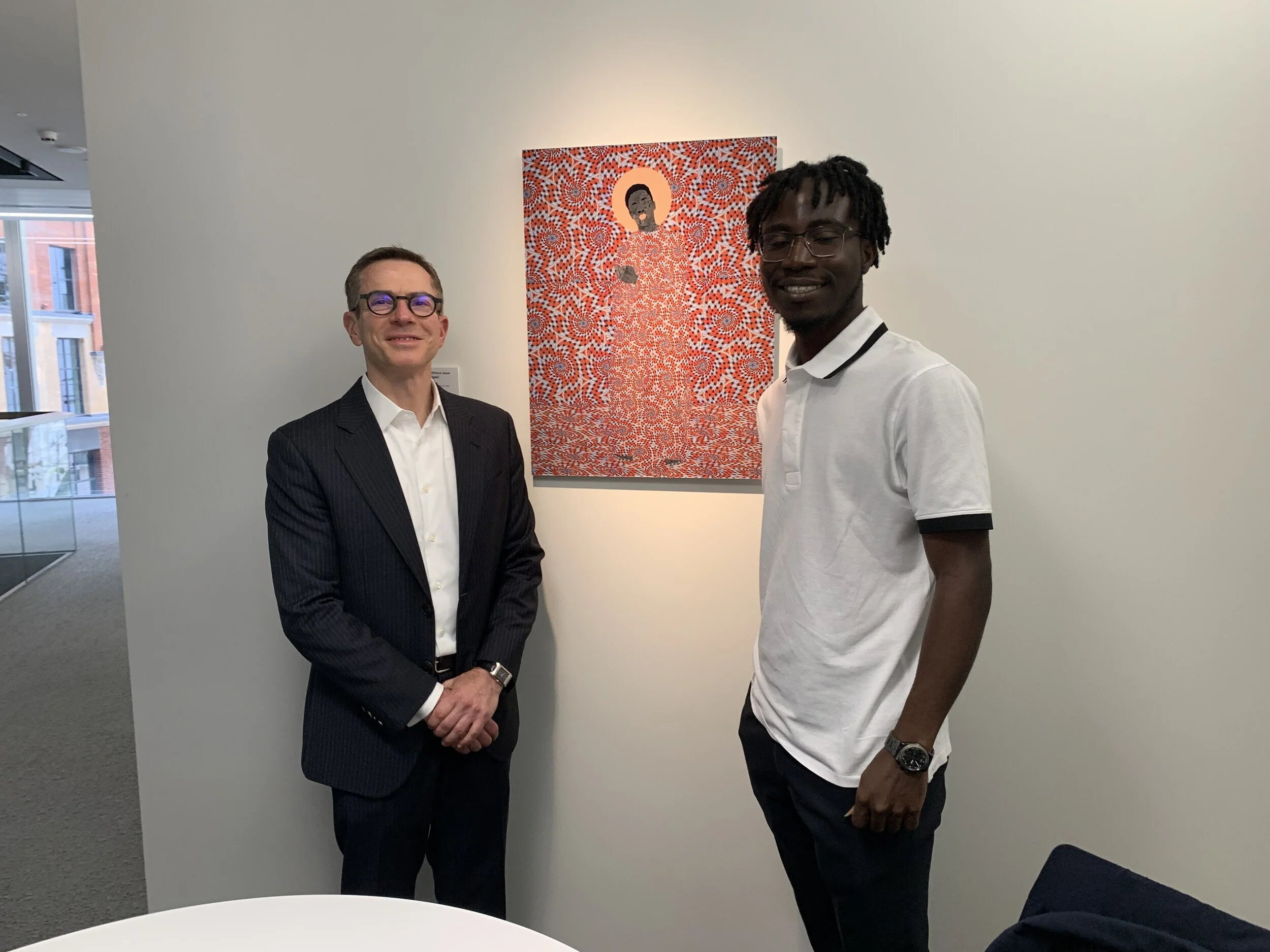 Dean Randy Kroszner of Chicago Booth, University of Chicago, and Osinachi at the University Campus with the work