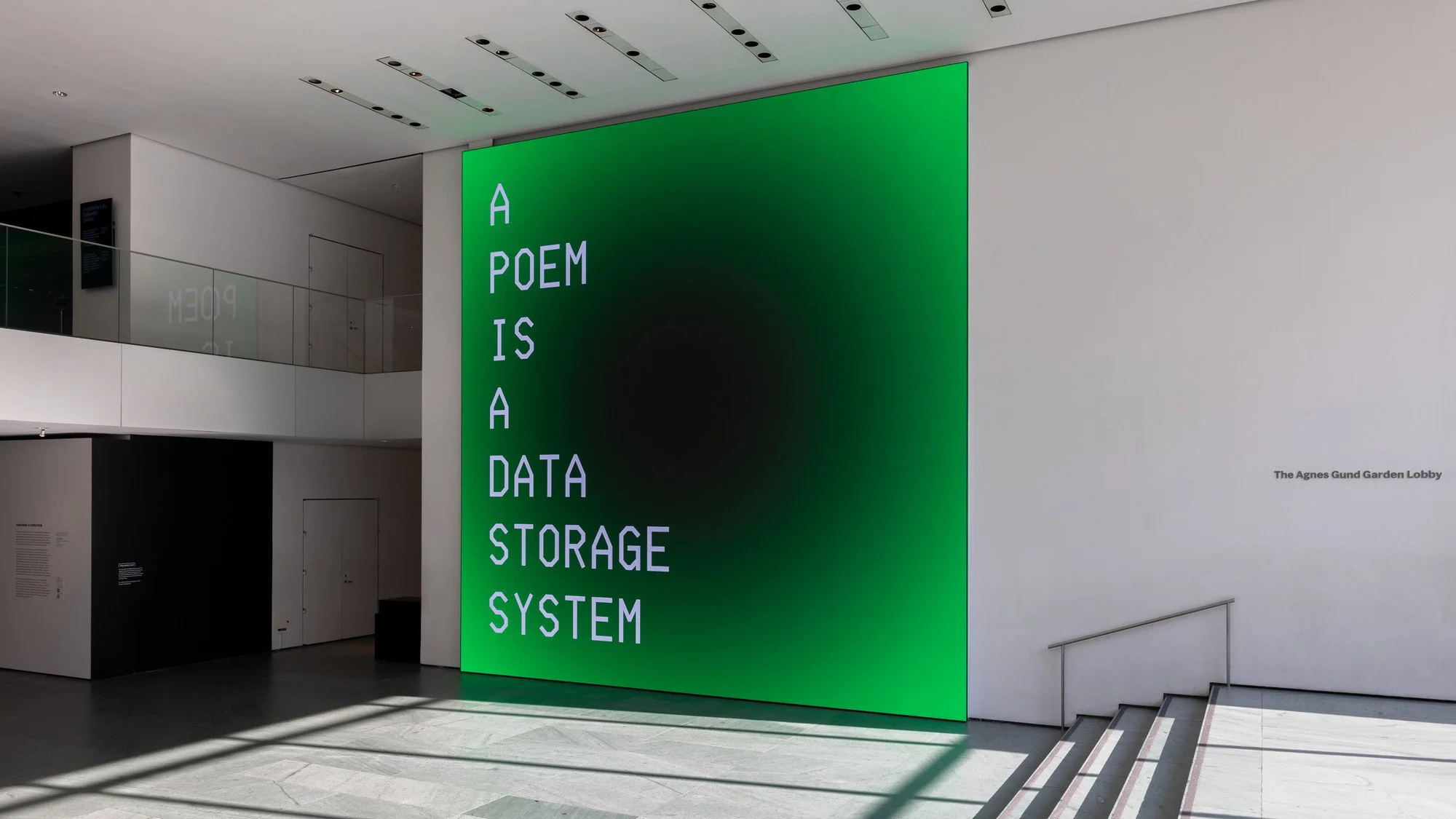 Stiles has described this work as a “poem in residence,” transforming the screen in the Museum lobby into an autonomous notebook. A LIVING POEM includes an intimate, immersive soundscape by Stiles’s studio partner, Kris Bones, that reminds us of poetry’s roots in oral tradition. This auditory experience is accessible via QR code. Together, these layers form a dynamic language system—a poem that reveals itself moment by moment, always becoming, never finished.