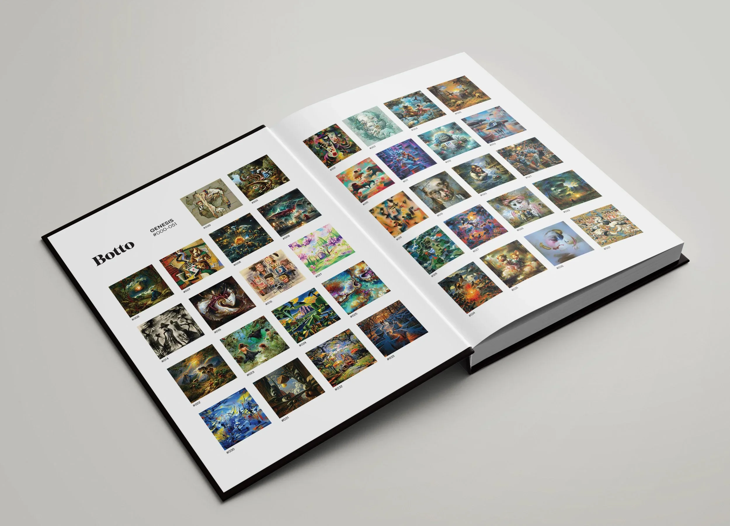 Anteism presents two new art publications by Botto, a decentralized autonomous artist. The first, Genesis: #000–051, is the primary monograph documenting Botto’s formative Genesis Period. The book is published in a public edition and surveys the 52 canonical works from Botto’s first year. To coincide with its release, BottoDAO has also produced 25 unique 1/1 special editions, each pairing a custom cover variant of the book with an accompanying 1/1 print.