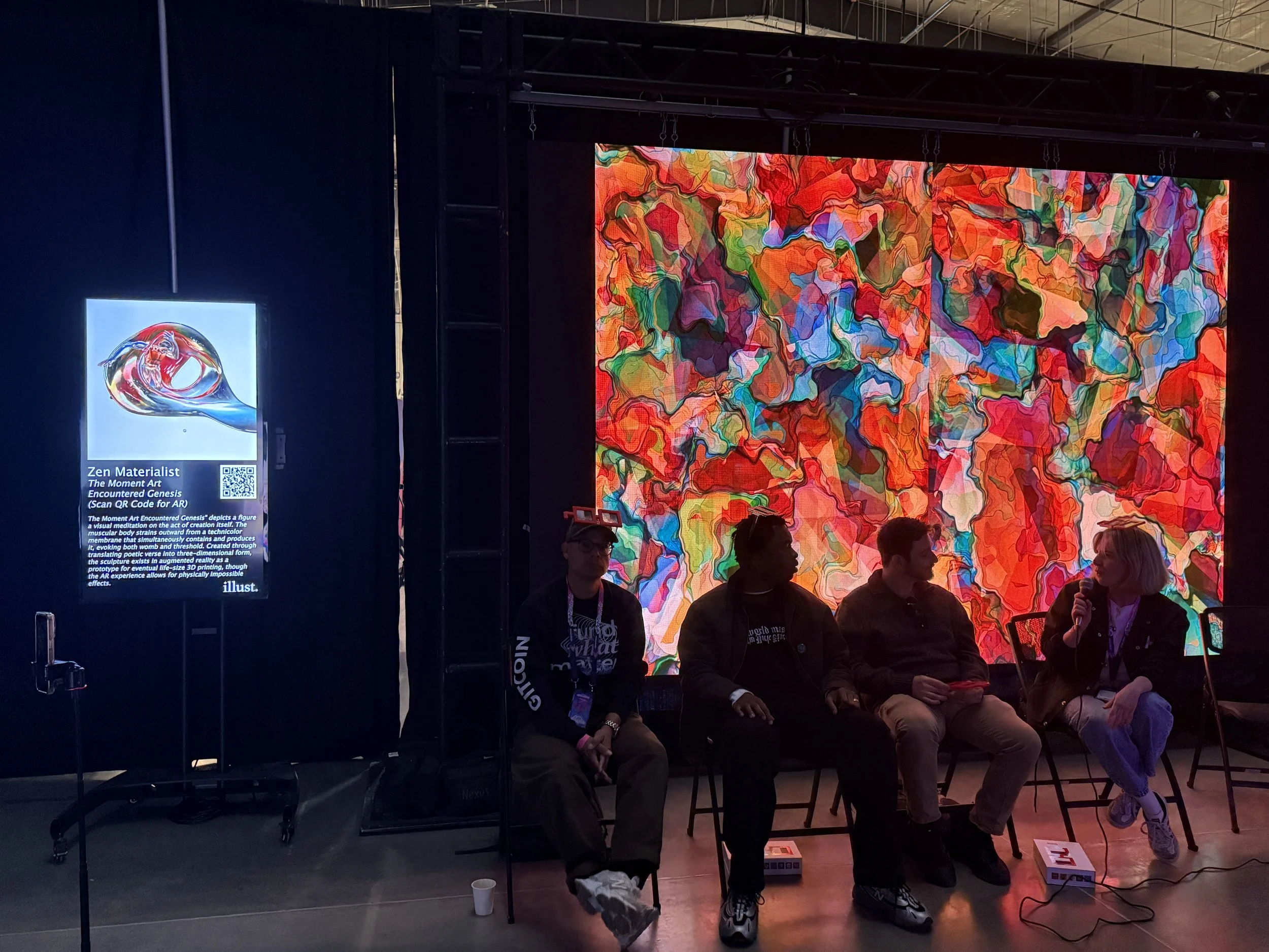 Manoloide, Tecrrain, 2025, on a screen in the background at ETHDenver.